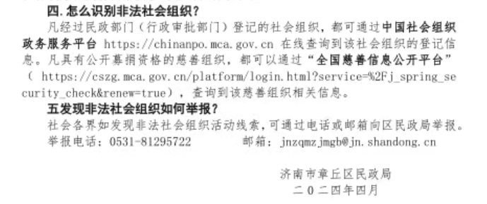 社会各界如发现非法社会组织活动线索,可通过电话或邮箱向区民政局举报。举报电话:0531-81295722 邮箱:jnzqmzjmgb@jn.shandong.cn
